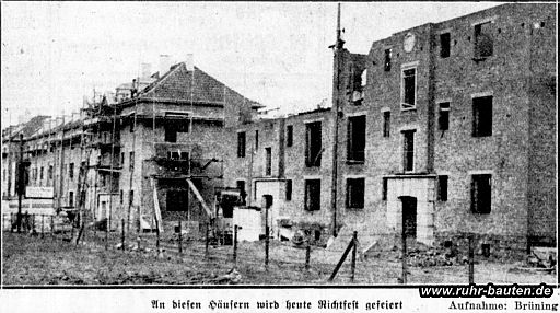weitere Quelle: Bochumer Anzeiger vom 10.12.1938, 12.12.1938 ("Traditionelles Richtfest. Als in den Samstagnachmittagsstunden an den eben gerichteten Neubauten der Vereinigten Baugesellschaft mbH Langendreer am Wiebuschweg, an dem neun Häuser mit 54 Wohnungen erbaut werden, die Hakenkreuzfahnen auf den Dachsparren aufgezogen wurden, war der feierliche Auftakt geboten zu dem traditionellen Richtfest. Die Bauherren, Architekten, Unternehmer, die Kameraden der Arbeit und die führenden Persönlichkeiten des Stadtteils waren erschienen. Die Vortragsfolge der Richtfestfeier wurde einleitend durch musikalische Darbietungen eines Arbeitskameraden eröffnet. Zur Begrüßung der großen Festgemeinde ergriff Stadtamtmann Knop (Bochum), der gleichzeitig Vorsitzender des AUfsichtsrates der Vereinigten Baugesellschaft mbH Langendreer ist, das Wort. Als Vertreter des Spar- und Bauvereins Familienwohl sprach Kamerad Huchthausen, der den Zimmerleuten, Maurern und übrigen Kameraden der Arbeit eine besondere Anerkennung für die geleistete Arbeit widmete. Für die Gilde fand Architekt Kolsenbach (Bochum) inhaltsreiche Worte, und für die Zimmerleute wünschte der Zimmermeister Metzner (Werne) ein weiteres gutes Gelingen der Arbeit.") und 26.05.1939